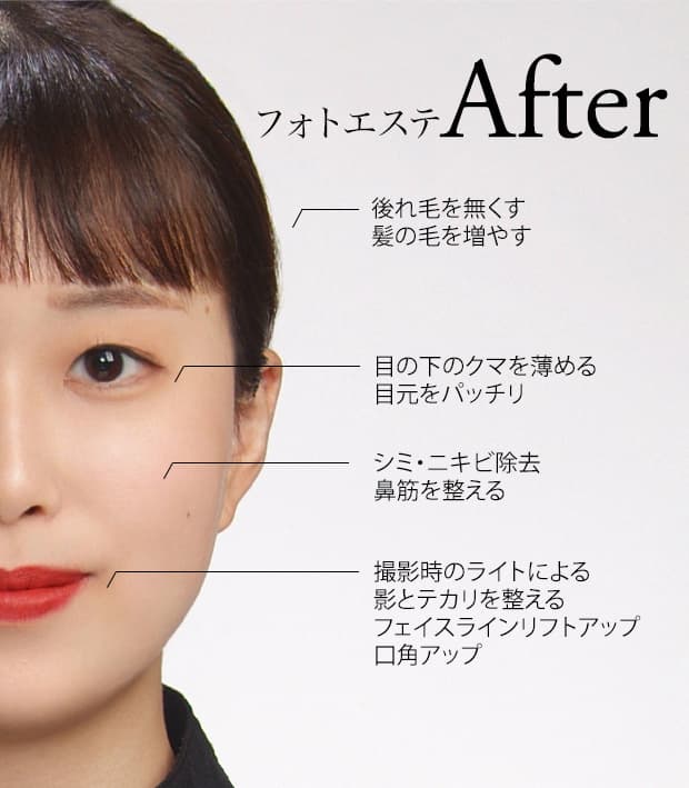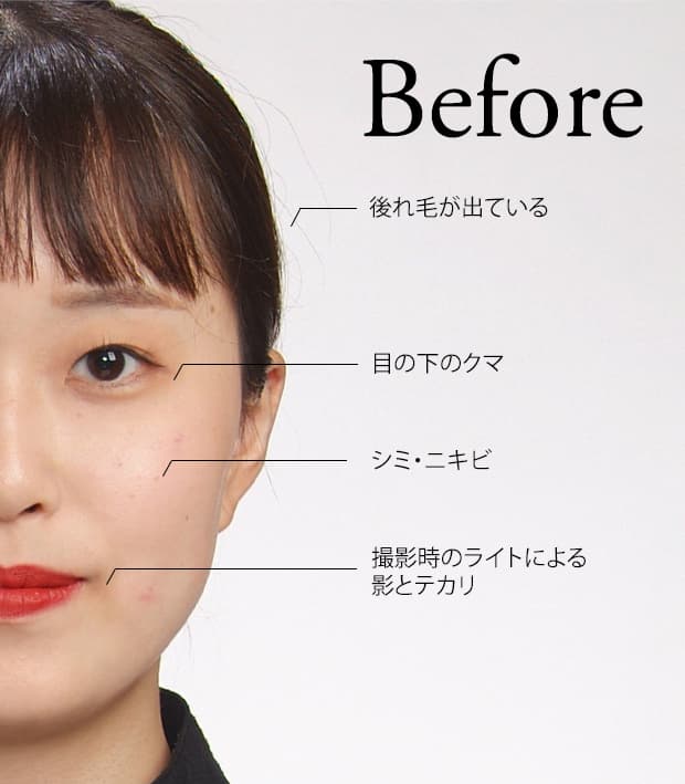 顔の輪郭が出るように撮影する為、両耳が見えるようにすること 目元ぎりぎりの前髪は分けていただく必要があります。